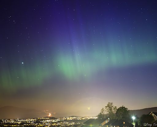 GEOMAGNETIC UNREST: Sky watchers around the Arctic Circle were surprised this morning, May 4th, when the twilight sky lit up with bands of green. "It was far from dark when the auroras appeared," says Ronny Tertnes, who sends this picture from Bergen, Norway:
